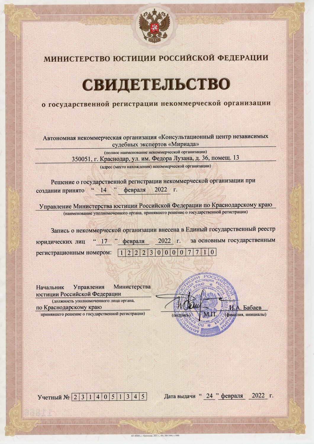 Автономная некоммерческая организация "Консультационный центр независимых судебных экспертов "Мириада" (АНО "МИРИАДА") создана в 2022 году. Деятельность ее обеспечивается опытными врачами судебно-медицинскими экспертами, имеющими большой стаж работы в государственных учреждениях судебно-медицинской экспертизы. Все эксперты имеют сертификаты специалиста и аккредитованы по специальности "судебно-медицинская экспертиза".